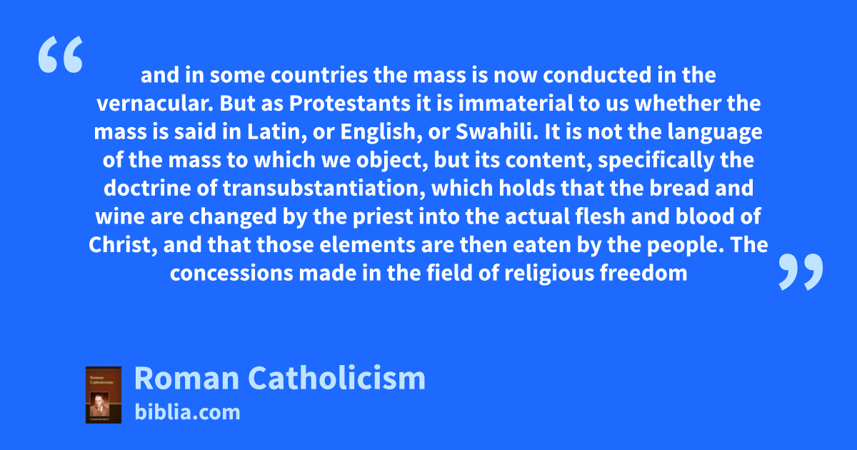 and in some countries the mass is now conducted in the vernacular. But as Protestants it is immaterial to us whether the mass is said in Latin, or English, or Swahili. It is not the language of the mass to which we object, but its content, specifically the doctrine of transubstantiation, which holds that the bread and wine are changed by the priest into the actual flesh and blood of Christ, and that those elements are then eaten by the people. The concessions made in the field of religious freedom