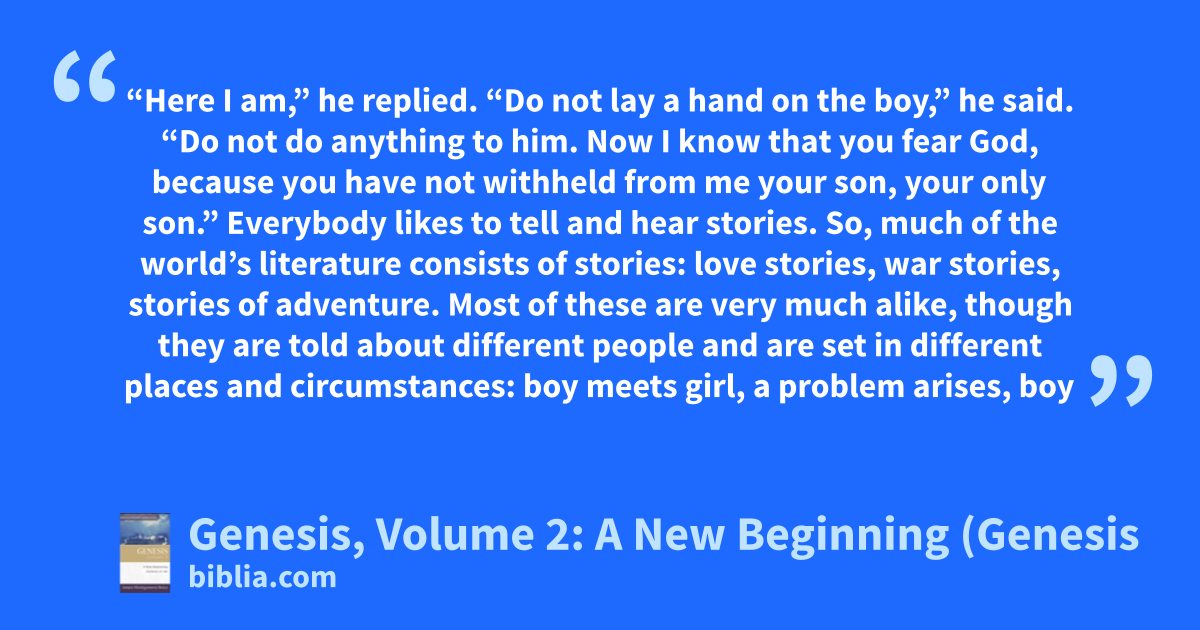 “Here I am,” he replied. “Do not lay a hand on the boy,” he said. “Do not do anything to him. Now I know that you fear God, because you have not withheld from me your son, your only son.” Everybody likes to tell and hear stories. So, much of the world’s literature consists of stories: love stories, war stories, stories of adventure. Most of these are very much alike, though they are told about different people and are set in different places and circumstances: boy meets girl, a problem arises, boy