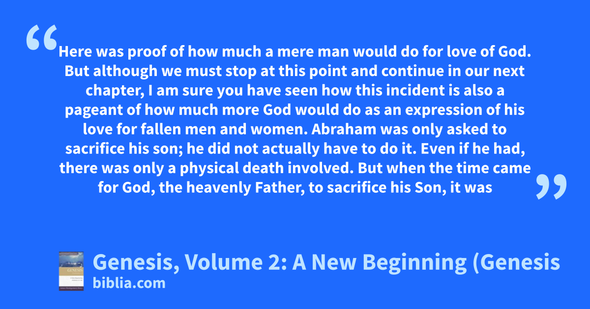 Here was proof of how much a mere man would do for love of God. But although we must stop at this point and continue in our next chapter, I am sure you have seen how this incident is also a pageant of how much more God would do as an expression of his love for fallen men and women. Abraham was only asked to sacrifice his son; he did not actually have to do it. Even if he had, there was only a physical death involved. But when the time came for God, the heavenly Father, to sacrifice his Son, it was