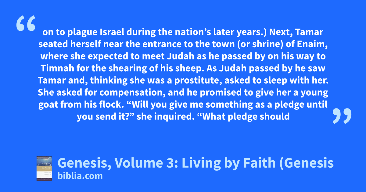 on to plague Israel during the nation’s later years.) Next, Tamar seated herself near the entrance to the town (or shrine) of Enaim, where she expected to meet Judah as he passed by on his way to Timnah for the shearing of his sheep. As Judah passed by he saw Tamar and, thinking she was a prostitute, asked to sleep with her. She asked for compensation, and he promised to give her a young goat from his flock. “Will you give me something as a pledge until you send it?” she inquired. “What pledge should