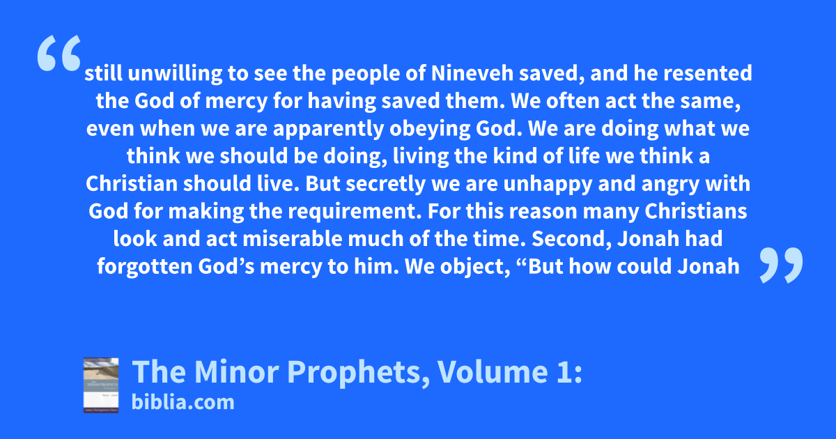 still unwilling to see the people of Nineveh saved, and he resented the God of mercy for having saved them. We often act the same, even when we are apparently obeying God. We are doing what we think we should be doing, living the kind of life we think a Christian should live. But secretly we are unhappy and angry with God for making the requirement. For this reason many Christians look and act miserable much of the time. Second, Jonah had forgotten God’s mercy to him. We object, “But how could Jonah