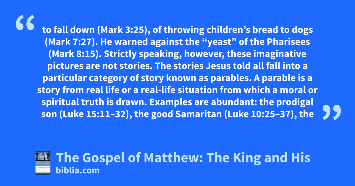 to fall down (Mark 3:25), of throwing children’s bread to dogs (Mark 7:27). He warned against the “yeast” of the Pharisees (Mark 8:15). Strictly speaking, however, these imaginative pictures are not stories. The stories Jesus told all fall into a particular category of story known as parables. A parable is a story from real life or a real-life situation from which a moral or spiritual truth is drawn. Examples are abundant: the prodigal son (Luke 15:11–32), the good Samaritan (Luke 10:25–37), the