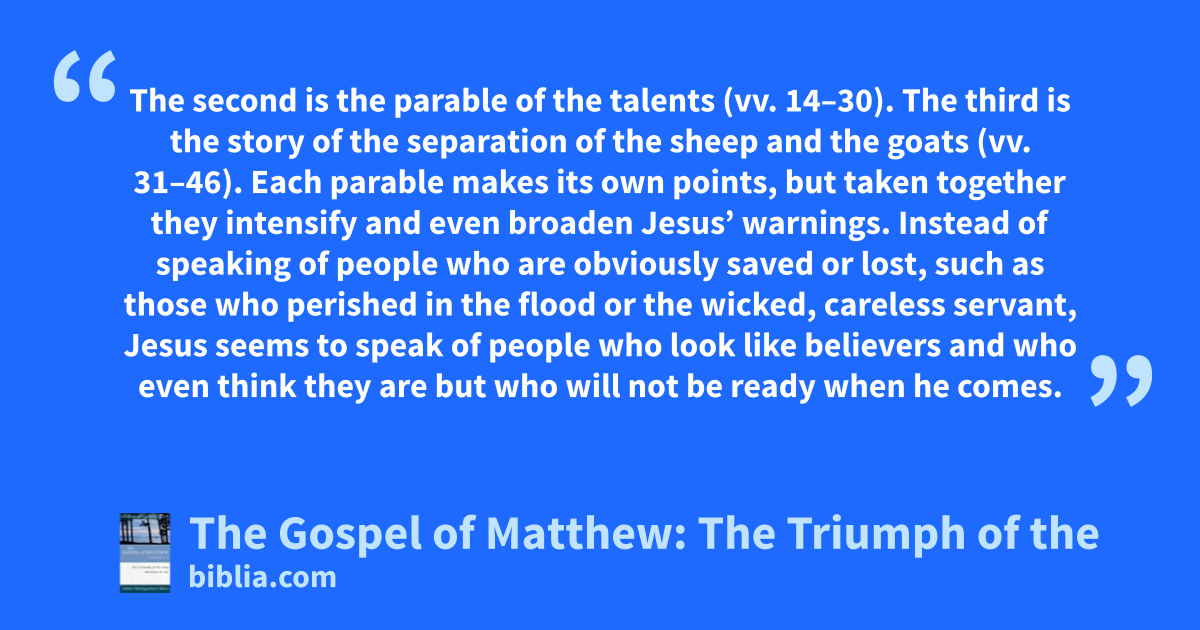 The second is the parable of the talents (vv. 14–30). The third is the story of the separation of the sheep and the goats (vv. 31–46). Each parable makes its own points, but taken together they intensify and even broaden Jesus’ warnings. Instead of speaking of people who are obviously saved or lost, such as those who perished in the flood or the wicked, careless servant, Jesus seems to speak of people who look like believers and who even think they are but who will not be ready when he comes.