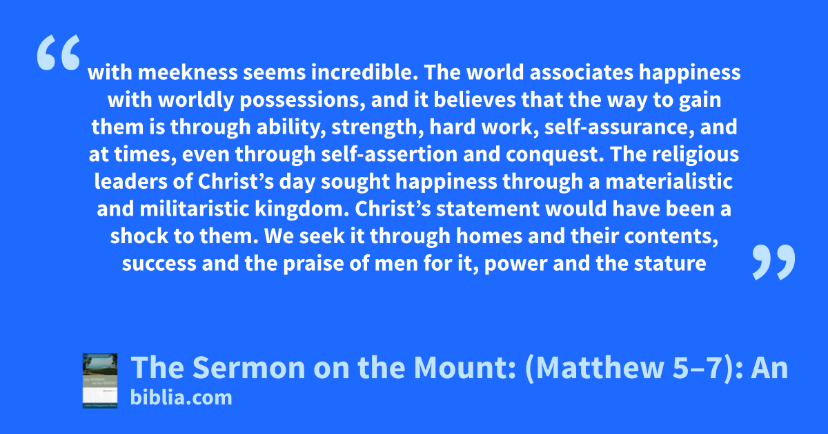 with meekness seems incredible. The world associates happiness with worldly possessions, and it believes that the way to gain them is through ability, strength, hard work, self-assurance, and at times, even through self-assertion and conquest. The religious leaders of Christ’s day sought happiness through a materialistic and militaristic kingdom. Christ’s statement would have been a shock to them. We seek it through homes and their contents, success and the praise of men for it, power and the stature