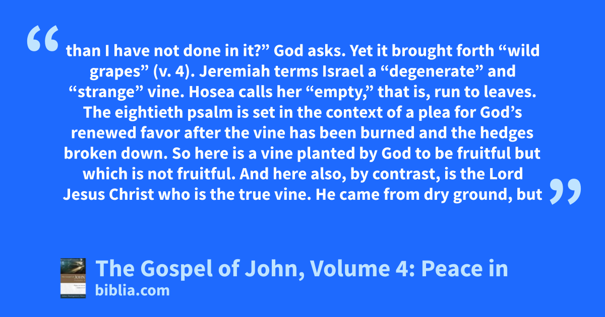 than I have not done in it?” God asks. Yet it brought forth “wild grapes” (v. 4). Jeremiah terms Israel a “degenerate” and “strange” vine. Hosea calls her “empty,” that is, run to leaves. The eightieth psalm is set in the context of a plea for God’s renewed favor after the vine has been burned and the hedges broken down. So here is a vine planted by God to be fruitful but which is not fruitful. And here also, by contrast, is the Lord Jesus Christ who is the true vine. He came from dry ground, but