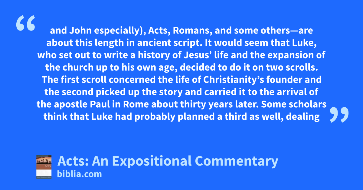 and John especially), Acts, Romans, and some others—are about this length in ancient script. It would seem that Luke, who set out to write a history of Jesus’ life and the expansion of the church up to his own age, decided to do it on two scrolls. The first scroll concerned the life of Christianity’s founder and the second picked up the story and carried it to the arrival of the apostle Paul in Rome about thirty years later. Some scholars think that Luke had probably planned a third as well, dealing