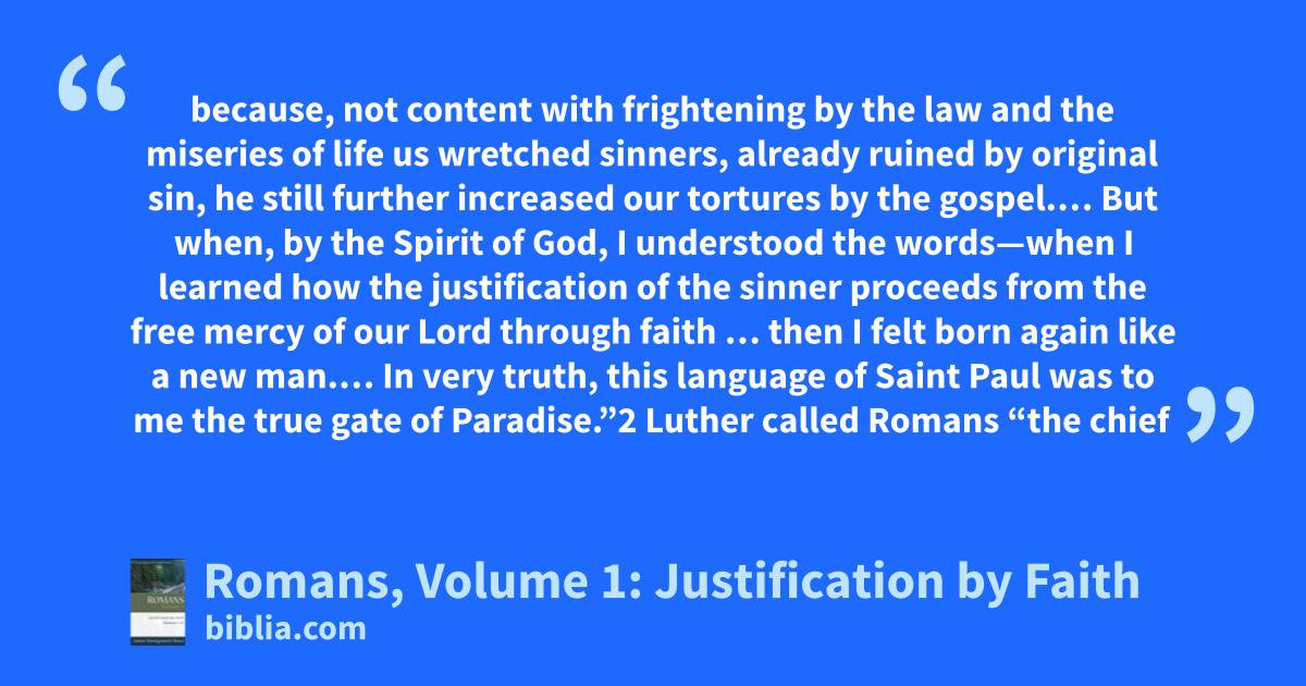 because, not content with frightening by the law and the miseries of life us wretched sinners, already ruined by original sin, he still further increased our tortures by the gospel.… But when, by the Spirit of God, I understood the words—when I learned how the justification of the sinner proceeds from the free mercy of our Lord through faith … then I felt born again like a new man.… In very truth, this language of Saint Paul was to me the true gate of Paradise.”2 Luther called Romans “the chief