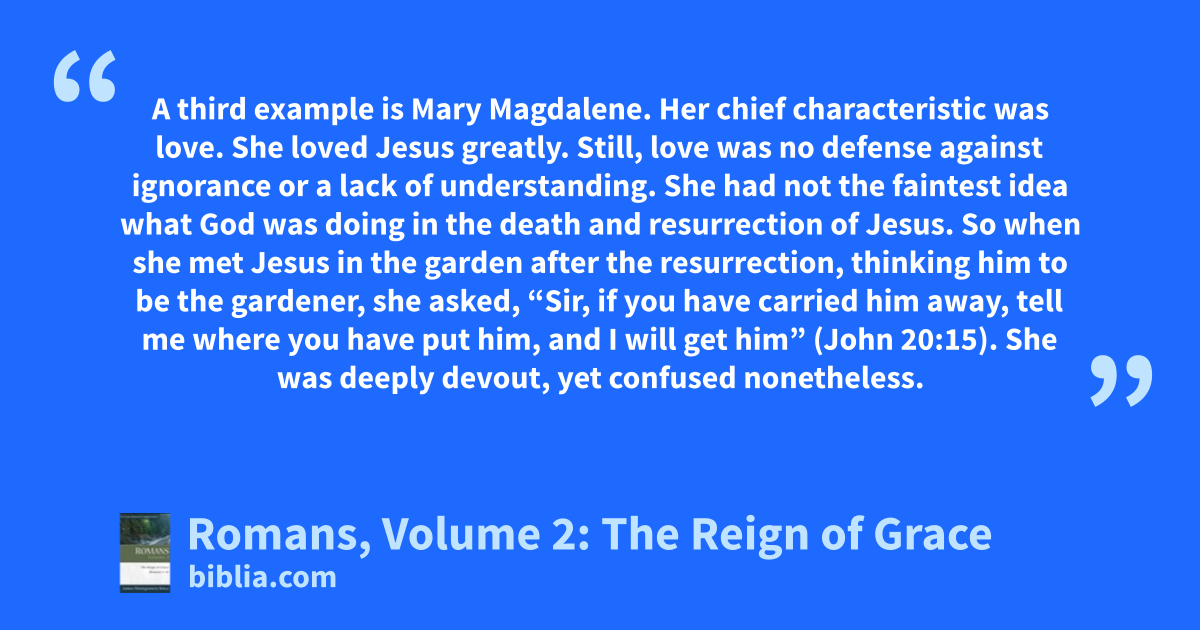 A third example is Mary Magdalene. Her chief characteristic was love. She loved Jesus greatly. Still, love was no defense against ignorance or a lack of understanding. She had not the faintest idea what God was doing in the death and resurrection of Jesus. So when she met Jesus in the garden after the resurrection, thinking him to be the gardener, she asked, “Sir, if you have carried him away, tell me where you have put him, and I will get him” (John 20:15). She was deeply devout, yet confused nonetheless.