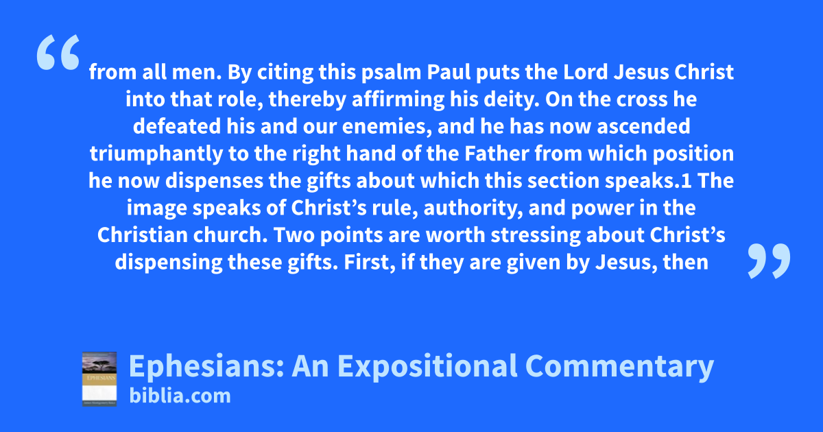 from all men. By citing this psalm Paul puts the Lord Jesus Christ into that role, thereby affirming his deity. On the cross he defeated his and our enemies, and he has now ascended triumphantly to the right hand of the Father from which position he now dispenses the gifts about which this section speaks.1 The image speaks of Christ’s rule, authority, and power in the Christian church. Two points are worth stressing about Christ’s dispensing these gifts. First, if they are given by Jesus, then