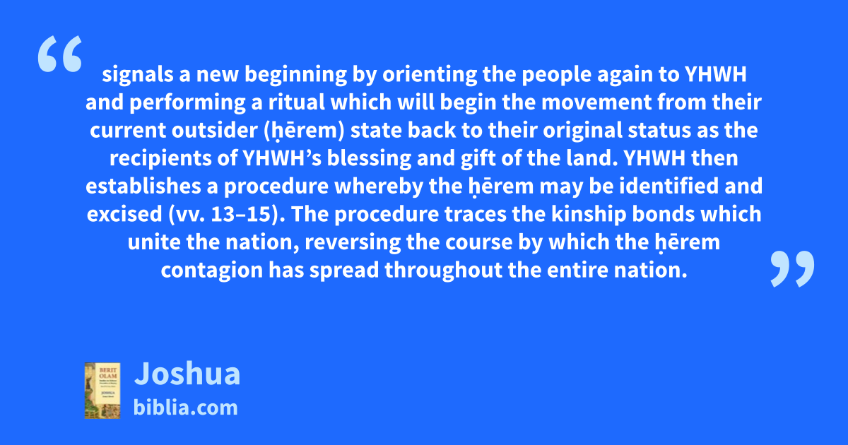 signals a new beginning by orienting the people again to YHWH and performing a ritual which will begin the movement from their current outsider (ḥērem) state back to their original status as the recipients of YHWH’s blessing and gift of the land. YHWH then establishes a procedure whereby the ḥērem may be identified and excised (vv. 13–15). The procedure traces the kinship bonds which unite the nation, reversing the course by which the ḥērem contagion has spread throughout the entire nation.