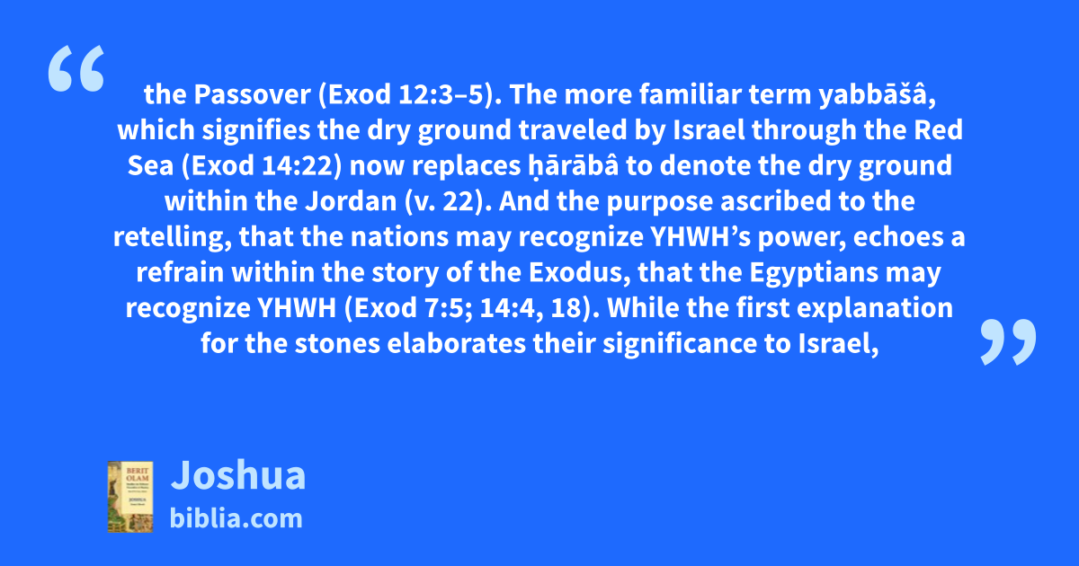 the Passover (Exod 12:3–5). The more familiar term yabbāšâ, which signifies the dry ground traveled by Israel through the Red Sea (Exod 14:22) now replaces ḥārābâ to denote the dry ground within the Jordan (v. 22). And the purpose ascribed to the retelling, that the nations may recognize YHWH’s power, echoes a refrain within the story of the Exodus, that the Egyptians may recognize YHWH (Exod 7:5; 14:4, 18). While the first explanation for the stones elaborates their significance to Israel,