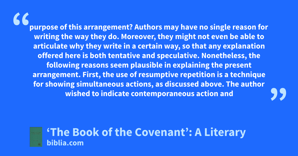 purpose of this arrangement? Authors may have no single reason for writing the way they do. Moreover, they might not even be able to articulate why they write in a certain way, so that any explanation offered here is both tentative and speculative. Nonetheless, the following reasons seem plausible in explaining the present arrangement. First, the use of resumptive repetition is a technique for showing simultaneous actions, as discussed above. The author wished to indicate contemporaneous action and