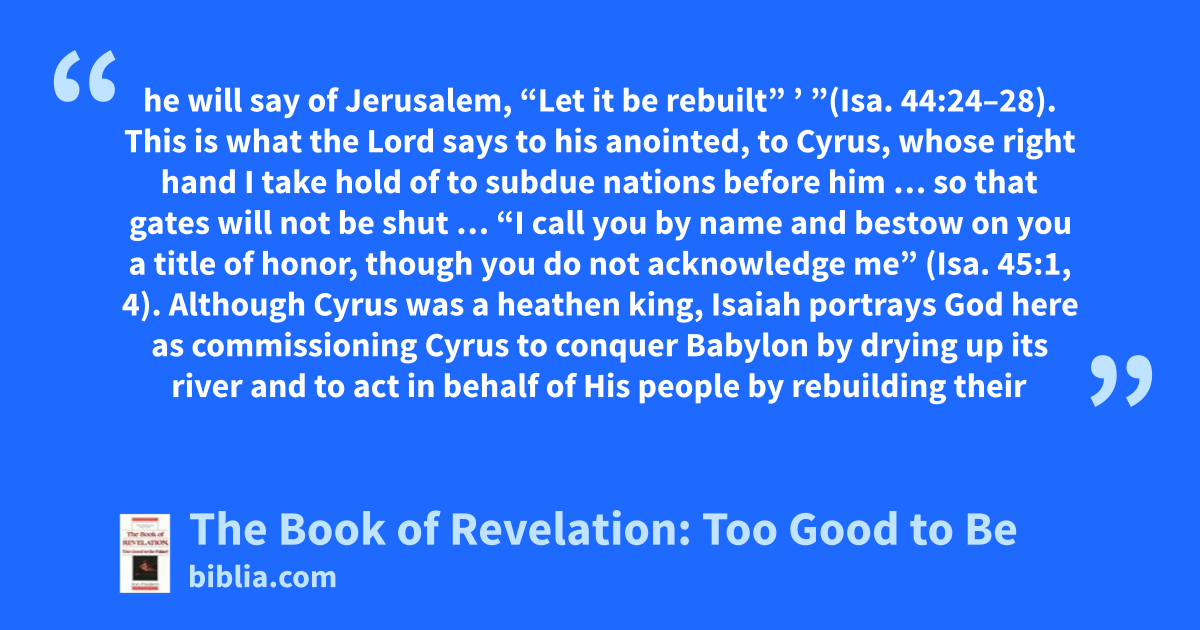he will say of Jerusalem, “Let it be rebuilt” ’ ”(Isa. 44:24–28). This is what the Lord says to his anointed, to Cyrus, whose right hand I take hold of to subdue nations before him … so that gates will not be shut … “I call you by name and bestow on you a title of honor, though you do not acknowledge me” (Isa. 45:1, 4). Although Cyrus was a heathen king, Isaiah portrays God here as commissioning Cyrus to conquer Babylon by drying up its river and to act in behalf of His people by rebuilding their