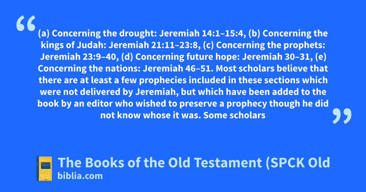 (a) Concerning the drought: Jeremiah 14:1–15:4, (b) Concerning the kings of Judah: Jeremiah 21:11–23:8, (c) Concerning the prophets: Jeremiah 23:9–40, (d) Concerning future hope: Jeremiah 30–31, (e) Concerning the nations: Jeremiah 46–51. Most scholars believe that there are at least a few prophecies included in these sections which were not delivered by Jeremiah, but which have been added to the book by an editor who wished to preserve a prophecy though he did not know whose it was. Some scholars