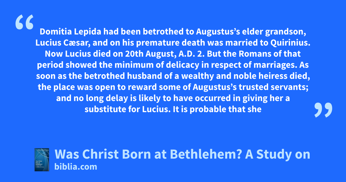 Domitia Lepida had been betrothed to Augustus’s elder grandson, Lucius Cæsar, and on his premature death was married to Quirinius. Now Lucius died on 20th August, A.D. 2. But the Romans of that period showed the minimum of delicacy in respect of marriages. As soon as the betrothed husband of a wealthy and noble heiress died, the place was open to reward some of Augustus’s trusted servants; and no long delay is likely to have occurred in giving her a substitute for Lucius. It is probable that she