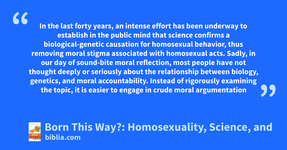 In the last forty years, an intense effort has been underway to establish in the public mind that science confirms a biological-genetic causation for homosexual behavior, thus removing moral stigma associated with homosexual acts. Sadly, in our day of sound-bite moral reflection, most people have not thought deeply or seriously about the relationship between biology, genetics, and moral accountability. Instead of rigorously examining the topic, it is easier to engage in crude moral argumentation
