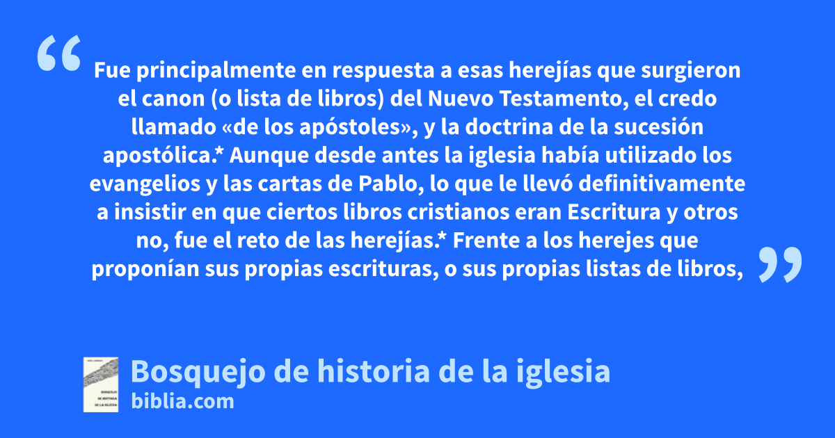 Fue principalmente en respuesta a esas herejías que surgieron el canon (o lista de libros) del Nuevo Testamento, el credo llamado «de los apóstoles», y la doctrina de la sucesión apostólica.* Aunque desde antes la iglesia había utilizado los evangelios y las cartas de Pablo, lo que le llevó definitivamente a insistir en que ciertos libros cristianos eran Escritura y otros no, fue el reto de las herejías.* Frente a los herejes que proponían sus propias escrituras, o sus propias listas de libros,