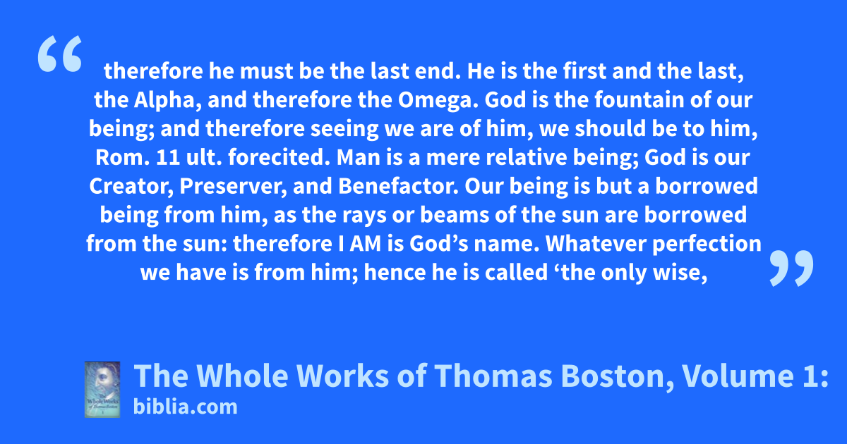 therefore he must be the last end. He is the first and the last, the Alpha, and therefore the Omega. God is the fountain of our being; and therefore seeing we are of him, we should be to him, Rom. 11 ult. forecited. Man is a mere relative being; God is our Creator, Preserver, and Benefactor. Our being is but a borrowed being from him, as the rays or beams of the sun are borrowed from the sun: therefore I AM is God’s name. Whatever perfection we have is from him; hence he is called ‘the only wise,