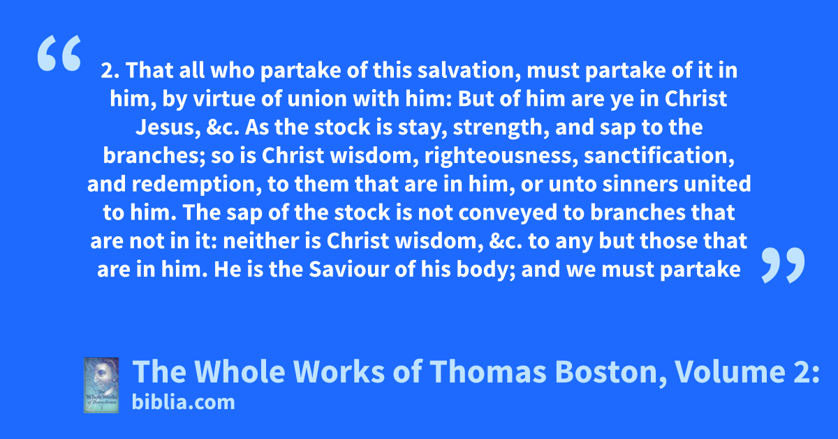 2. That all who partake of this salvation, must partake of it in him, by virtue of union with him: But of him are ye in Christ Jesus, &c. As the stock is stay, strength, and sap to the branches; so is Christ wisdom, righteousness, sanctification, and redemption, to them that are in him, or unto sinners united to him. The sap of the stock is not conveyed to branches that are not in it: neither is Christ wisdom, &c. to any but those that are in him. He is the Saviour of his body; and we must partake