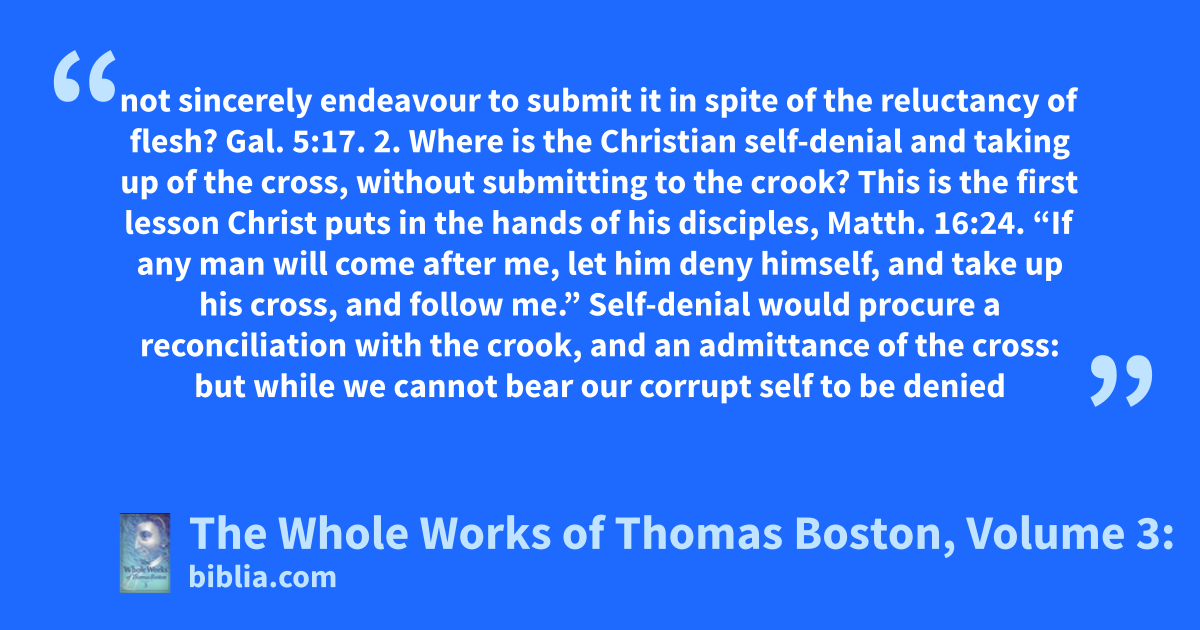 not sincerely endeavour to submit it in spite of the reluctancy of flesh? Gal. 5:17. 2. Where is the Christian self-denial and taking up of the cross, without submitting to the crook? This is the first lesson Christ puts in the hands of his disciples, Matth. 16:24. “If any man will come after me, let him deny himself, and take up his cross, and follow me.” Self-denial would procure a reconciliation with the crook, and an admittance of the cross: but while we cannot bear our corrupt self to be denied