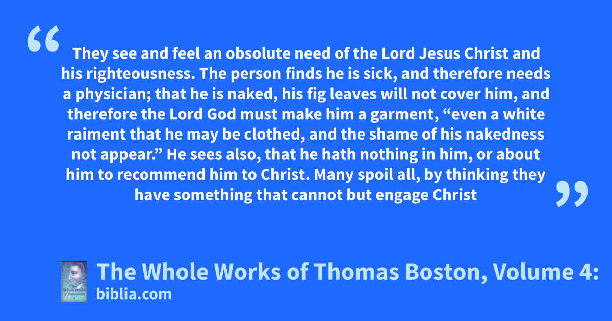 They see and feel an obsolute need of the Lord Jesus Christ and his righteousness. The person finds he is sick, and therefore needs a physician; that he is naked, his fig leaves will not cover him, and therefore the Lord God must make him a garment, “even a white raiment that he may be clothed, and the shame of his nakedness not appear.” He sees also, that he hath nothing in him, or about him to recommend him to Christ. Many spoil all, by thinking they have something that cannot but engage Christ