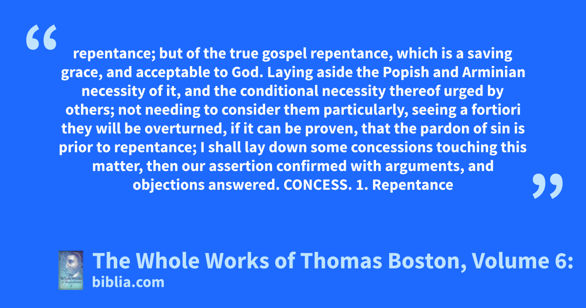 repentance; but of the true gospel repentance, which is a saving grace, and acceptable to God. Laying aside the Popish and Arminian necessity of it, and the conditional necessity thereof urged by others; not needing to consider them particularly, seeing a fortiori they will be overturned, if it can be proven, that the pardon of sin is prior to repentance; I shall lay down some concessions touching this matter, then our assertion confirmed with arguments, and objections answered. CONCESS. 1. Repentance