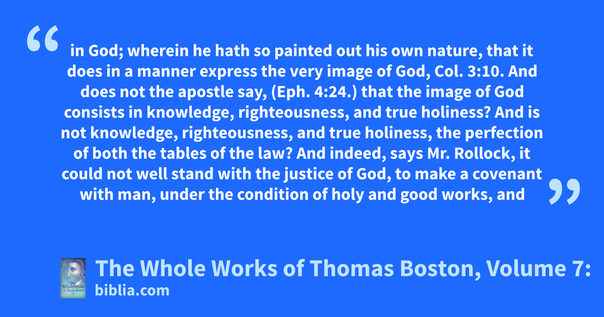 in God; wherein he hath so painted out his own nature, that it does in a manner express the very image of God, Col. 3:10. And does not the apostle say, (Eph. 4:24.) that the image of God consists in knowledge, righteousness, and true holiness? And is not knowledge, righteousness, and true holiness, the perfection of both the tables of the law? And indeed, says Mr. Rollock, it could not well stand with the justice of God, to make a covenant with man, under the condition of holy and good works, and