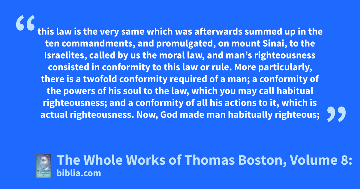 this law is the very same which was afterwards summed up in the ten commandments, and promulgated, on mount Sinai, to the Israelites, called by us the moral law, and man’s righteousness consisted in conformity to this law or rule. More particularly, there is a twofold conformity required of a man; a conformity of the powers of his soul to the law, which you may call habitual righteousness; and a conformity of all his actions to it, which is actual righteousness. Now, God made man habitually righteous;
