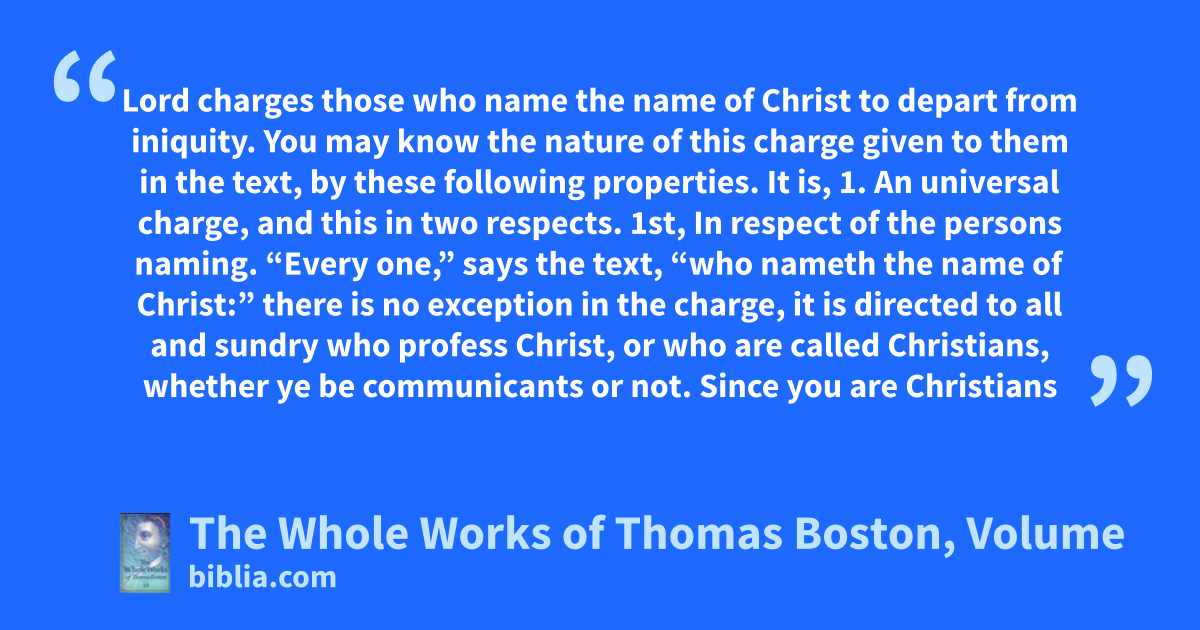 Lord charges those who name the name of Christ to depart from iniquity. You may know the nature of this charge given to them in the text, by these following properties. It is, 1. An universal charge, and this in two respects. 1st, In respect of the persons naming. “Every one,” says the text, “who nameth the name of Christ:” there is no exception in the charge, it is directed to all and sundry who profess Christ, or who are called Christians, whether ye be communicants or not. Since you are Christians