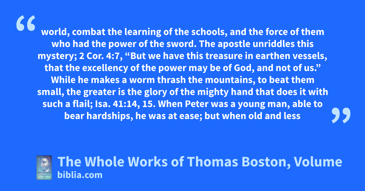 world, combat the learning of the schools, and the force of them who had the power of the sword. The apostle unriddles this mystery; 2 Cor. 4:7, “But we have this treasure in earthen vessels, that the excellency of the power may be of God, and not of us.” While he makes a worm thrash the mountains, to beat them small, the greater is the glory of the mighty hand that does it with such a flail; Isa. 41:14, 15. When Peter was a young man, able to bear hardships, he was at ease; but when old and less