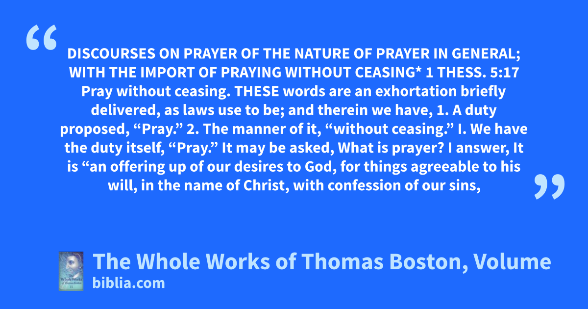 DISCOURSES ON PRAYER OF THE NATURE OF PRAYER IN GENERAL; WITH THE IMPORT OF PRAYING WITHOUT CEASING* 1 THESS. 5:17 Pray without ceasing. THESE words are an exhortation briefly delivered, as laws use to be; and therein we have, 1. A duty proposed, “Pray.” 2. The manner of it, “without ceasing.” I. We have the duty itself, “Pray.” It may be asked, What is prayer? I answer, It is “an offering up of our desires to God, for things agreeable to his will, in the name of Christ, with confession of our sins,