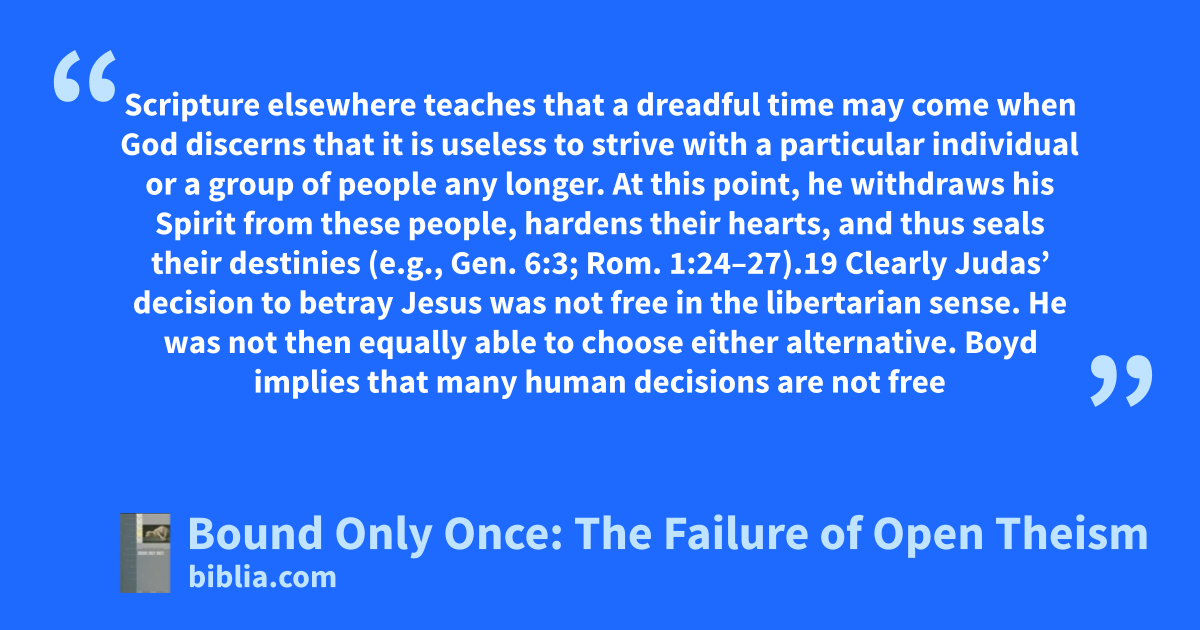 Scripture elsewhere teaches that a dreadful time may come when God discerns that it is useless to strive with a particular individual or a group of people any longer. At this point, he withdraws his Spirit from these people, hardens their hearts, and thus seals their destinies (e.g., Gen. 6:3; Rom. 1:24–27).19 Clearly Judas’ decision to betray Jesus was not free in the libertarian sense. He was not then equally able to choose either alternative. Boyd implies that many human decisions are not free
