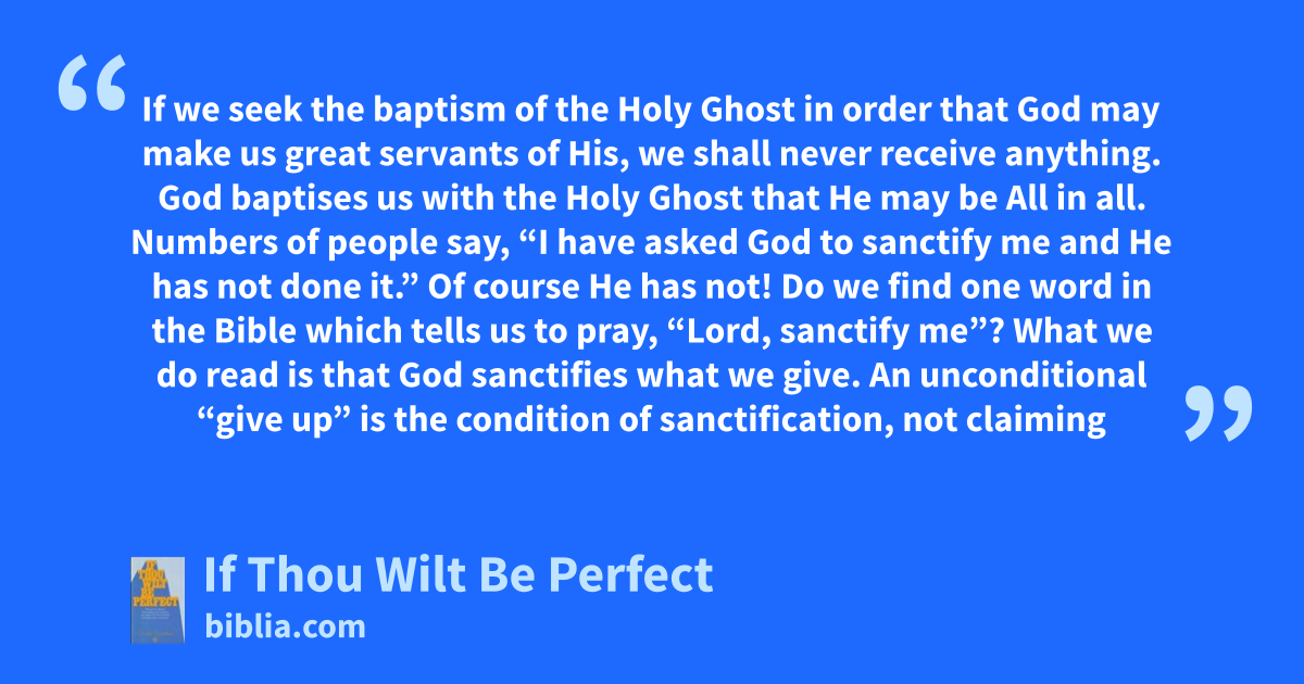 If we seek the baptism of the Holy Ghost in order that God may make us great servants of His, we shall never receive anything. God baptises us with the Holy Ghost that He may be All in all. Numbers of people say, “I have asked God to sanctify me and He has not done it.” Of course He has not! Do we find one word in the Bible which tells us to pray, “Lord, sanctify me”? What we do read is that God sanctifies what we give. An unconditional “give up” is the condition of sanctification, not claiming