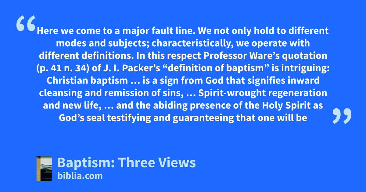 Here we come to a major fault line. We not only hold to different modes and subjects; characteristically, we operate with different definitions. In this respect Professor Ware’s quotation (p. 41 n. 34) of J. I. Packer’s “definition of baptism” is intriguing: Christian baptism … is a sign from God that signifies inward cleansing and remission of sins, … Spirit-wrought regeneration and new life, … and the abiding presence of the Holy Spirit as God’s seal testifying and guaranteeing that one will be