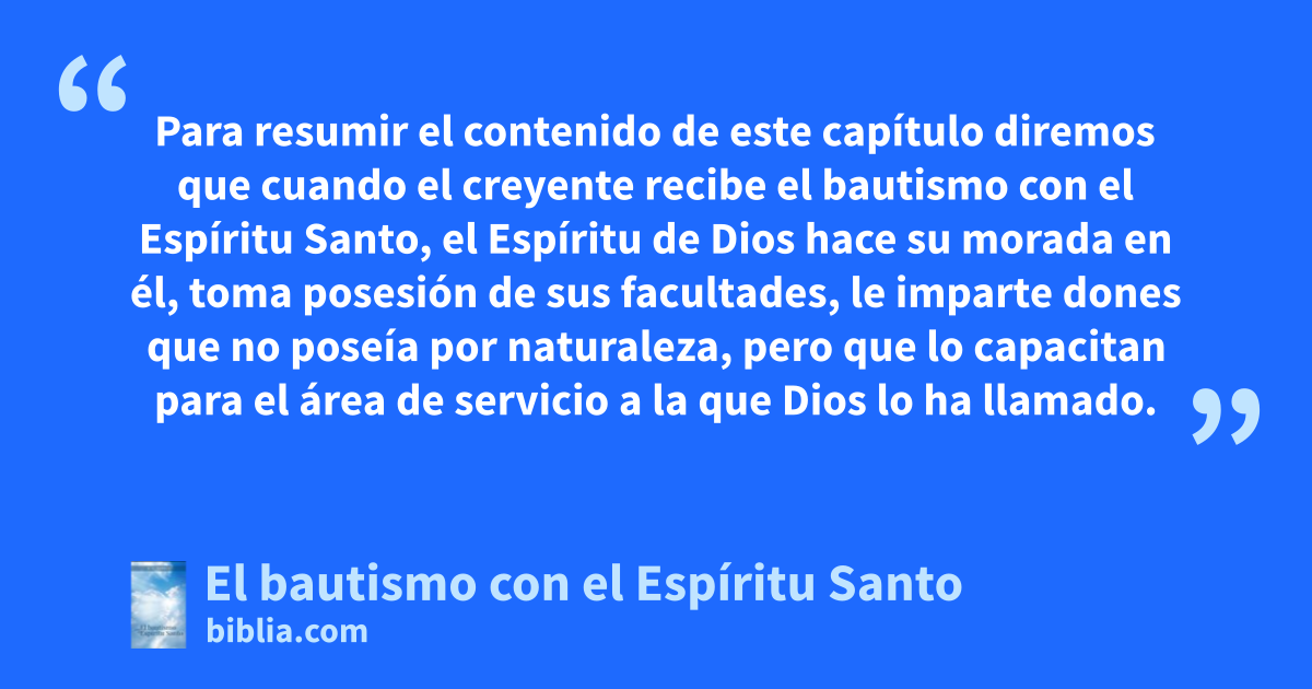Para resumir el contenido de este capítulo diremos que cuando el creyente recibe el bautismo con el Espíritu Santo, el Espíritu de Dios hace su morada en él, toma posesión de sus facultades, le imparte dones que no poseía por naturaleza, pero que lo capacitan para el área de servicio a la que Dios lo ha llamado.