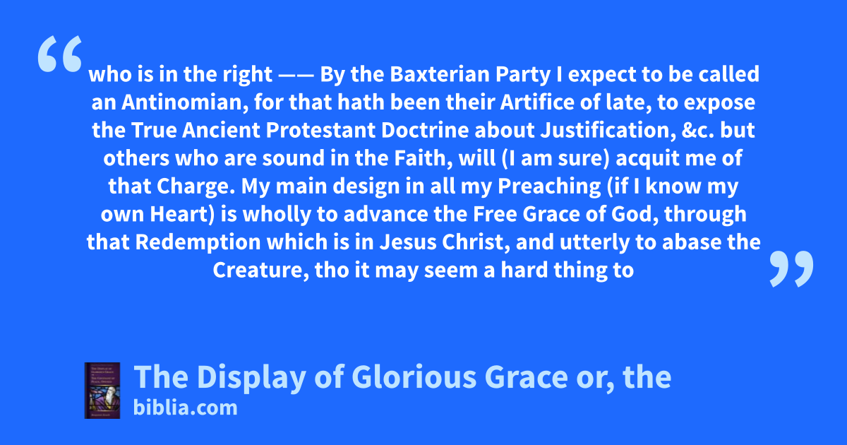 who is in the right —— By the Baxterian Party I expect to be called an Antinomian, for that hath been their Artifice of late, to expose the True Ancient Protestant Doctrine about Justification, &c. but others who are sound in the Faith, will (I am sure) acquit me of that Charge. My main design in all my Preaching (if I know my own Heart) is wholly to advance the Free Grace of God, through that Redemption which is in Jesus Christ, and utterly to abase the Creature, tho it may seem a hard thing to