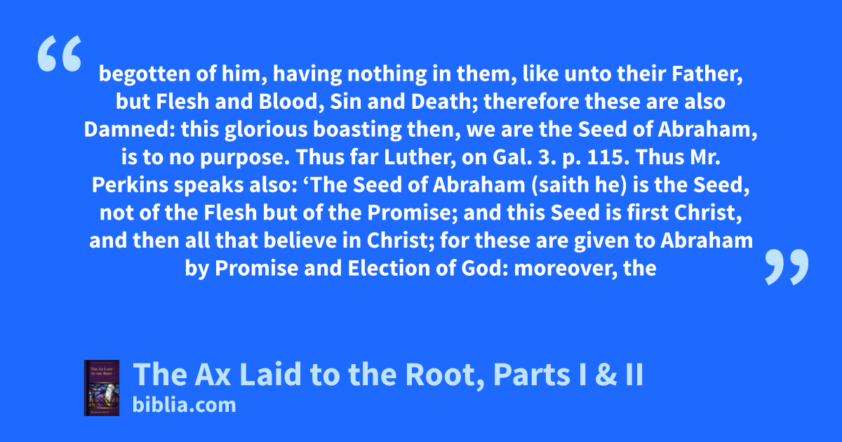 begotten of him, having nothing in them, like unto their Father, but Flesh and Blood, Sin and Death; therefore these are also Damned: this glorious boasting then, we are the Seed of Abraham, is to no purpose. Thus far Luther, on Gal. 3. p. 115. Thus Mr. Perkins speaks also: ‘The Seed of Abraham (saith he) is the Seed, not of the Flesh but of the Promise; and this Seed is first Christ, and then all that believe in Christ; for these are given to Abraham by Promise and Election of God: moreover, the