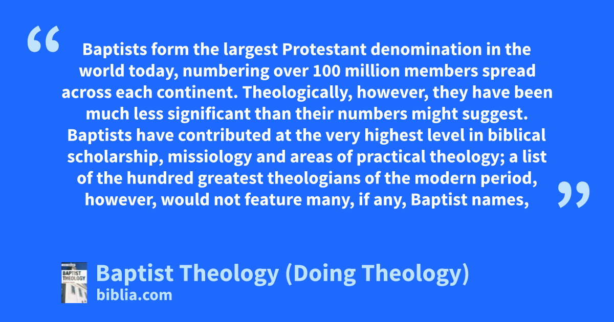 Baptists form the largest Protestant denomination in the world today, numbering over 100 million members spread across each continent. Theologically, however, they have been much less significant than their numbers might suggest. Baptists have contributed at the very highest level in biblical scholarship, missiology and areas of practical theology; a list of the hundred greatest theologians of the modern period, however, would not feature many, if any, Baptist names,