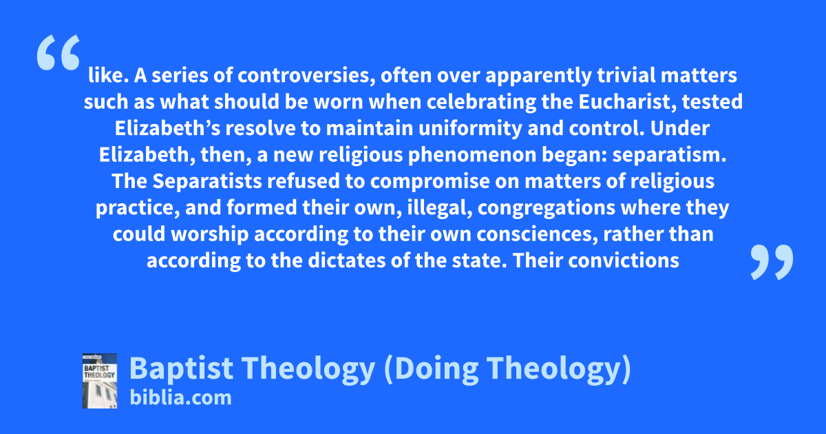 like. A series of controversies, often over apparently trivial matters such as what should be worn when celebrating the Eucharist, tested Elizabeth’s resolve to maintain uniformity and control. Under Elizabeth, then, a new religious phenomenon began: separatism. The Separatists refused to compromise on matters of religious practice, and formed their own, illegal, congregations where they could worship according to their own consciences, rather than according to the dictates of the state. Their convictions