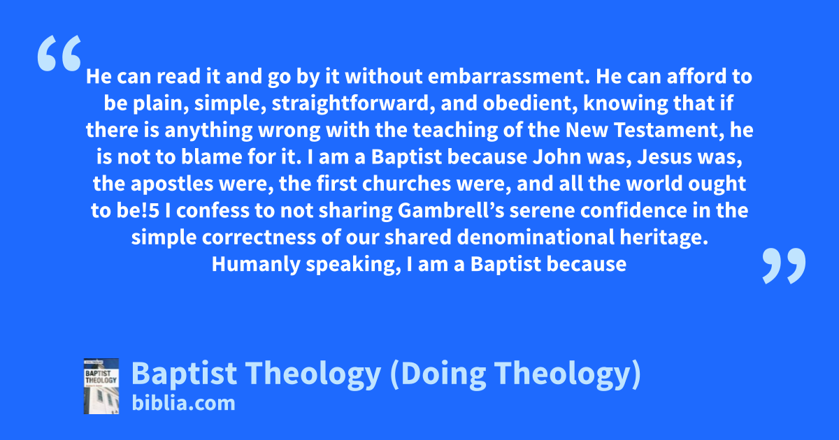 He can read it and go by it without embarrassment. He can afford to be plain, simple, straightforward, and obedient, knowing that if there is anything wrong with the teaching of the New Testament, he is not to blame for it. I am a Baptist because John was, Jesus was, the apostles were, the first churches were, and all the world ought to be!5 I confess to not sharing Gambrell’s serene confidence in the simple correctness of our shared denominational heritage. Humanly speaking, I am a Baptist because