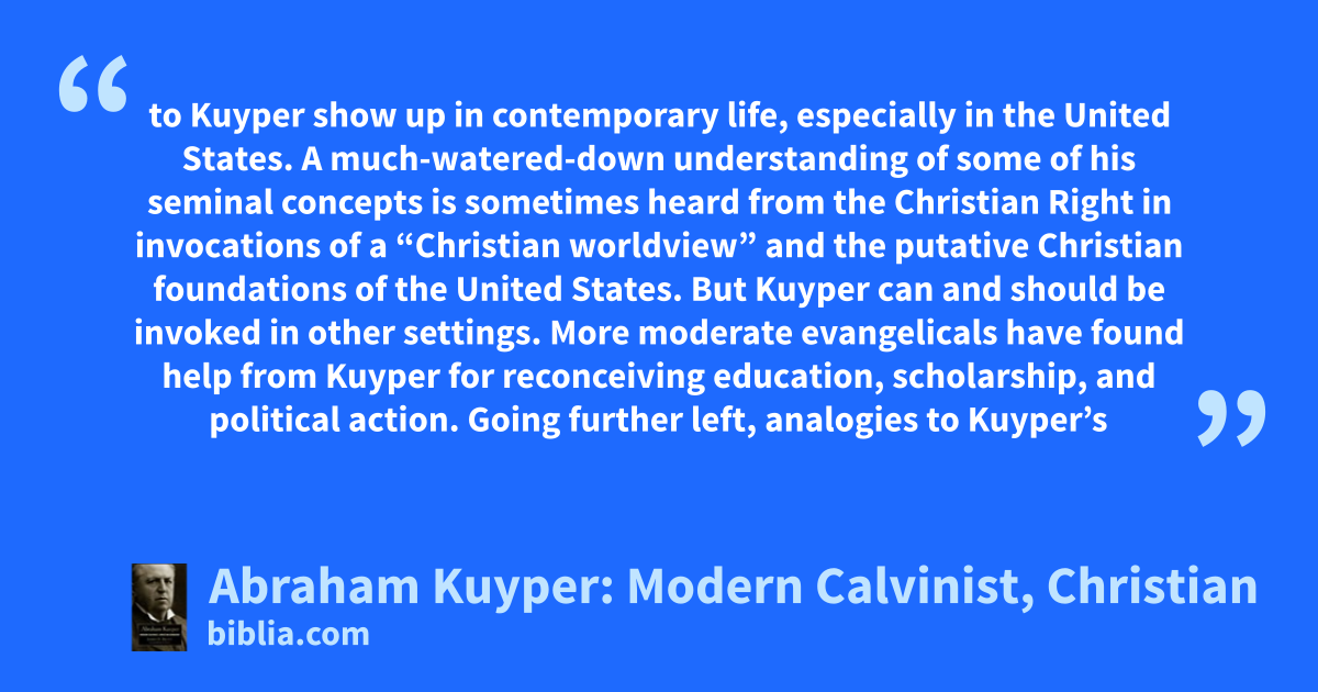 to Kuyper show up in contemporary life, especially in the United States. A much-watered-down understanding of some of his seminal concepts is sometimes heard from the Christian Right in invocations of a “Christian worldview” and the putative Christian foundations of the United States. But Kuyper can and should be invoked in other settings. More moderate evangelicals have found help from Kuyper for reconceiving education, scholarship, and political action. Going further left, analogies to Kuyper’s