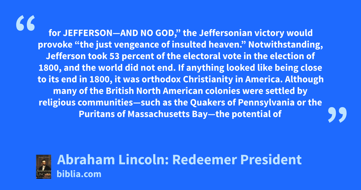 for JEFFERSON—AND NO GOD,” the Jeffersonian victory would provoke “the just vengeance of insulted heaven.” Notwithstanding, Jefferson took 53 percent of the electoral vote in the election of 1800, and the world did not end. If anything looked like being close to its end in 1800, it was orthodox Christianity in America. Although many of the British North American colonies were settled by religious communities—such as the Quakers of Pennsylvania or the Puritans of Massachusetts Bay—the potential of