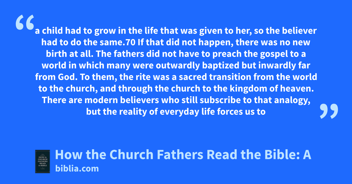 a child had to grow in the life that was given to her, so the believer had to do the same.70 If that did not happen, there was no new birth at all. The fathers did not have to preach the gospel to a world in which many were outwardly baptized but inwardly far from God. To them, the rite was a sacred transition from the world to the church, and through the church to the kingdom of heaven. There are modern believers who still subscribe to that analogy, but the reality of everyday life forces us to