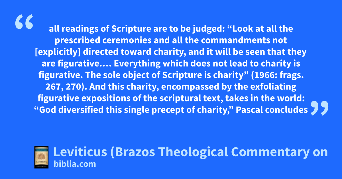 all readings of Scripture are to be judged: “Look at all the prescribed ceremonies and all the commandments not [explicitly] directed toward charity, and it will be seen that they are figurative.… Everything which does not lead to charity is figurative. The sole object of Scripture is charity” (1966: frags. 267, 270). And this charity, encompassed by the exfoliating figurative expositions of the scriptural text, takes in the world: “God diversified this single precept of charity,” Pascal concludes