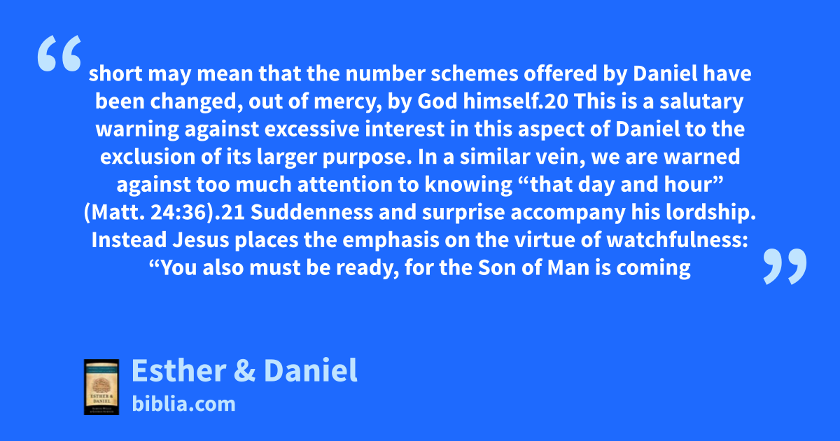 short may mean that the number schemes offered by Daniel have been changed, out of mercy, by God himself.20 This is a salutary warning against excessive interest in this aspect of Daniel to the exclusion of its larger purpose. In a similar vein, we are warned against too much attention to knowing “that day and hour” (Matt. 24:36).21 Suddenness and surprise accompany his lordship. Instead Jesus places the emphasis on the virtue of watchfulness: “You also must be ready, for the Son of Man is coming