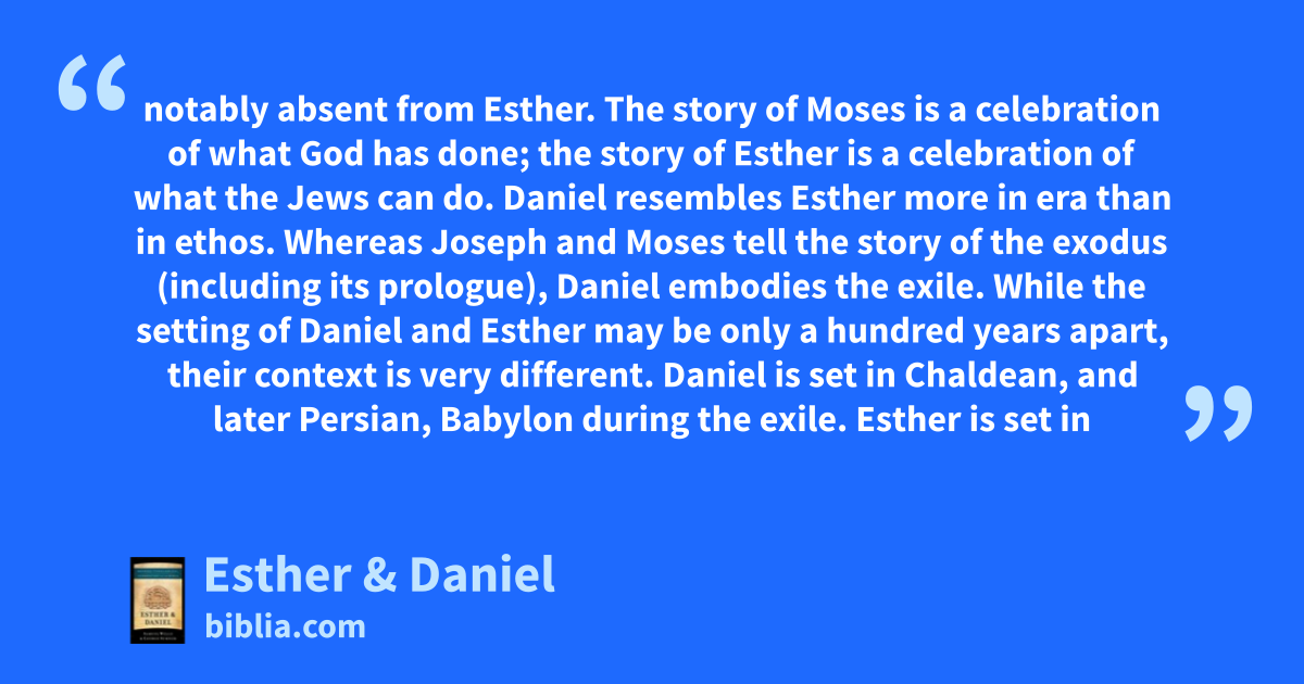 notably absent from Esther. The story of Moses is a celebration of what God has done; the story of Esther is a celebration of what the Jews can do. Daniel resembles Esther more in era than in ethos. Whereas Joseph and Moses tell the story of the exodus (including its prologue), Daniel embodies the exile. While the setting of Daniel and Esther may be only a hundred years apart, their context is very different. Daniel is set in Chaldean, and later Persian, Babylon during the exile. Esther is set in
