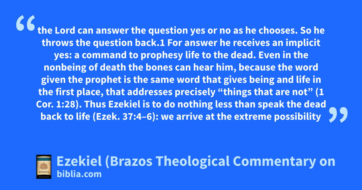 the Lord can answer the question yes or no as he chooses. So he throws the question back.1 For answer he receives an implicit yes: a command to prophesy life to the dead. Even in the nonbeing of death the bones can hear him, because the word given the prophet is the same word that gives being and life in the first place, that addresses precisely “things that are not” (1 Cor. 1:28). Thus Ezekiel is to do nothing less than speak the dead back to life (Ezek. 37:4–6): we arrive at the extreme possibility