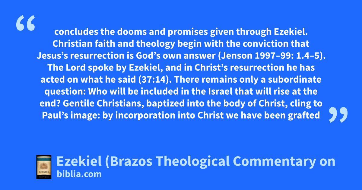concludes the dooms and promises given through Ezekiel. Christian faith and theology begin with the conviction that Jesus’s resurrection is God’s own answer (Jenson 1997–99: 1.4–5). The Lord spoke by Ezekiel, and in Christ’s resurrection he has acted on what he said (37:14). There remains only a subordinate question: Who will be included in the Israel that will rise at the end? Gentile Christians, baptized into the body of Christ, cling to Paul’s image: by incorporation into Christ we have been grafted