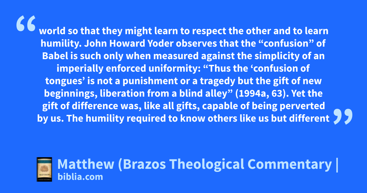 world so that they might learn to respect the other and to learn humility. John Howard Yoder observes that the “confusion” of Babel is such only when measured against the simplicity of an imperially enforced uniformity: “Thus the ‘confusion of tongues’ is not a punishment or a tragedy but the gift of new beginnings, liberation from a blind alley” (1994a, 63). Yet the gift of difference was, like all gifts, capable of being perverted by us. The humility required to know others like us but different