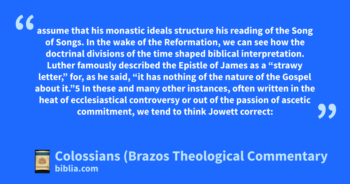 assume that his monastic ideals structure his reading of the Song of Songs. In the wake of the Reformation, we can see how the doctrinal divisions of the time shaped biblical interpretation. Luther famously described the Epistle of James as a “strawy letter,” for, as he said, “it has nothing of the nature of the Gospel about it.”5 In these and many other instances, often written in the heat of ecclesiastical controversy or out of the passion of ascetic commitment, we tend to think Jowett correct: